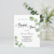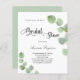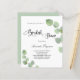 Een witte achtergrond versierd met eucalyptusgroenery sprigs. Personaliseer en de naam van de bruid om te zijn en partijdetails. Achterzijde: groene achtergrond.