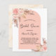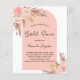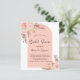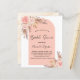 Voor een modern boho-vrijgezellenfeest. Een lijst van boog, wit en roos gouden kleur als achtergrond. Gedecormeerd met roos goud en roze floralen, rozen en pamapgras. Pas een naam en details aan en voeg deze toe. Achterzijde: lichte roos goudmarmer afdrukken.