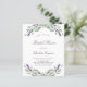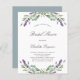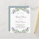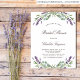 Een witte achtergrond versierd met lavendere bloemen en eucalyptusgroen. Personaliseer en een naam en details. Achterzijde: groene grijze achtergrond.