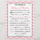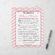 Op zoek naar een grappig vrijgezellenfeest of bruiloft spel? Stop de zoekopdracht! Dit spel is waar je naar op zoek was! Met de Romance van The Bride en Groom als kenmerkend onderwerp, kunnen uw gasten de spaties invullen om een van een soort romance verhaal over de bruid en de bruom te creëer. Dit is een leuk en vaak grappig vrijgezellenfeest spel! Het ontwerp is voorzien van een roze en witte chevron zigzag achtergrond om een modern vrijgezellenfeest- of trouwpartijspel te maken. Auteursrechtenhenishuispapier