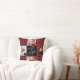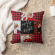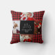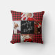 Moderne script Merry & Bright red buffalo plaid kerstfoto's kussen met ruimte voor vier foto's en je familienaam omringd door een leuk quilt patroonraster.