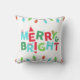 Een grillig kerstkussen met de uitdrukking 'Merry and Bright' in felle tinten rood, groen en blauwgroen.