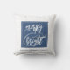 Heerlijk vakantiekussen met Merry & Bright in decoratief script en blauwe sneeuwvlokken. Pas aan met uw familienaam. Overeenkomende objecten in onze winkel.