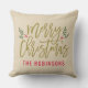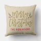 Het seizoensgebonden kussen ontwerp kenmerkt een modern antiek gouden manuscript "Zure Kerstmis"met rode douanetekst die met uw familienaam kan worden gepersonaliseerd. Groene takken van heilige bladeren en rode bessen accentueren het ontwerp. Neutrale beige achtergrondkleur.