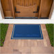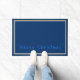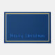 Doormat getoond met een diepe blauwe achtergrond, lichtblauw en goudkleurige randen rond de doormat en met de uitdrukking "prettige kerst" in een vrolijke tekst in helder blauw nabij de onderkant van de doormat.