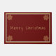 Doormat met een diepe rode kruidenachtergrond, zilverkleurige en goudkleurige randen rond het portret en de uitdrukking "pretkerst" in een vrolijke tekst in goudkleurige omgeving nabij de onderkant van het portier en vier sneeuwvlokken in goudkleurige .