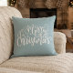 Licht blauw kussen in landschapstijl. "Vrolijk kerstfeest" citaat tekst geschreven als kalligrafie woordvoerder. Vind meer overeenkomende objecten in mijn Collectie "Kerstmis in rood, blauw en wit"