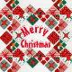 Een vierkant arrangement van kerstcadeaus op een wit houten oppervlak, met de woorden "Vrolijk kerstfeest" in het midden. De cadeaus zijn in verschillende tinten rood, groen en wit, met verschillende patronen zoals strepen, stippen, sterren en kerstbomen. Elk cadeau is verbonden met een lint en boog. De woorden "Merry Christmas" zijn in een feestelijk rood lettertype met een sneeuwachtig effect op de top. Het houten oppervlak heeft een lichte, natuurlijke korrel.