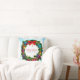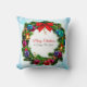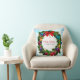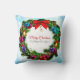 Fun-vakantiekussens met een kerstkreet met versiering van sierplanten, bellen en snoeprietjes en "Vrolijk Kerstfeest en Gelukkig Nieuwjaar".