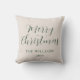 Seizoensgebonden kussenontwerp heeft een modern elegant script groen "Vrolijk kerstfeest" , met een crème beige achtergrond, en aangepaste tekst die kan worden gepersonaliseerd met uw achternaam.