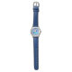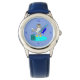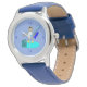 Dit geweldige horloge heeft een schattige kleine grijze en witte pinguïn met donkere ogen en gele snavel en poten. De pinguïn houdt een grote blauwe vis vast met één flipper en staat op een bleke blauwe klomp ijs. Er is een open cadeau naast de pinguïn, compleet met een feestelijk lintje.