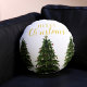 vrolijk kerstfeest! Het is een dubbelzijdig rond kussen en op de achterzijde staan meer feestelijke kerstbomen.