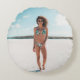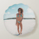 Vrouw met bikini op zand rond kussen
