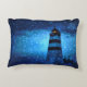Een kussenhoes voor zeevaart- en zomerinterieur, binnen of buiten. Een vuurtoren op een stormachtige nacht met donkere wolken en regen. Een zwak licht is te zien in de vuurtoren. Een donkerblauw beeld bedekt met druppels als regendruppels of zeespray. De vuurtoren, een symbool van hoop in de donkerste nachten, leiding, richting en hulp. Een veilige reis of haven.