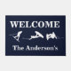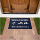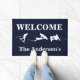 Een doormat voor de wakeboarding enthousiast. Deze doormat bevat drie witte silhouettes van wakeboarders. Pas de tekst aan met je eigen familienaam, zin of wat je ook maar wilt.