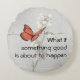 Rond kussen met een bloemenachtergrond en een monarchvlinder met het gezegde What if Something Good staat op het punt te gebeuren. Geweldig cadeau om een vriend aan te moedigen.
