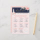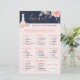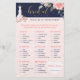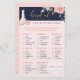 Een elegante, stijlvolle en trendy bloemrijke rozentuin bruidssalon "wat zit er in je tas" bruidssalon spel. Het ontwerp bevat onze handgeschilderde chic, elegant en modern ragfijne witte en bleke roze roze trouwjurk met een botanische tuin van bloeiende rozen en bloemen. De bloemrijke jurk hangt aan een sierlijke vintage stijl namaak gouden jurkhanger. Zachte bloem kant details en glinsterende emblemen op de trouwjurk creëren een mooie, verfijnde en luxueuze uitstraling. Een mooie script stijl handgeschreven typografie "Bruid" in goud. Het marineblauw, roze roze en namaak gouden kleurpalet creëert een trendy, shabby chic en vintage stijl uitstraling. Waterverf bloemrozen omranden de bovenkant. De achterkant heeft een minimalistische bleke roze achtergrond met