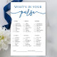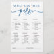 Gasten controleren welke voorwerpen ze in hun tas hebben en tellen hun punten op. Degene met het hoogste totaal wint! Een perfecte aanvulling op uw klassieke blauwe bruiloftsthema.