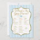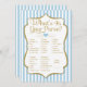 Wat zit er in je paardenspel voor baby shower en vrijgezellenfeest? Met lichtblauw en witte strepen en goudfaux glitter accent en gouden tekst. Dit elegante gestreepte Purse Game zal zeker lachen en gelach naar je volgende douche brengen.