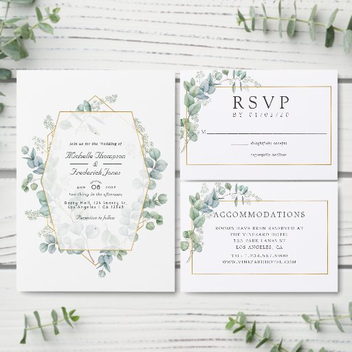 Bos eucalyptus groenvoorziening bruiloft save the date met gouden geometrische lijst aanpasbaar aan uw evenement details.