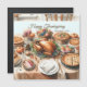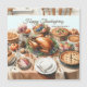 Watercolor illustratie van een mooi gearrangeerde Thanksgiving-maaltijd op een houten eettafel. Het middelpunt is een geroosterde kalkoen omringd door een reeks kleurrijke schotels. Kleine decoratieve pompoenen accentueren de tafel en er zijn kaarsen die een warme gloed geven. De tafelopstelling omvat borden, bestek en glazen, waardoor een sfeervolle, feestelijke sfeer ontstaat. Ontworpen door kunstenaar Danguole Serstinskaja