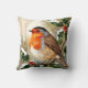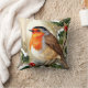 A cozy Christmas throw pillow featuring a soft watercolor robin perched on festive holly with gentle snowfall. Perfect for warm winter décor, rustic cabins, woodland Christmas themes, and anyone who loves classic holiday wildlife art.