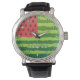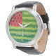 Rood en groen watermeloen met strepen en zaden. Aangepaste tekst.