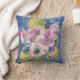 Een verstuiving van waterverf bloemen in tinten blauw, lavender, roze en violet wordt ondersteund door penseelstreken van metallisch goud en een rijke donkerblauwe achtergrond. De rechterrand heeft een dunne lijn van blauw glitter om een aanraking van whimsy toe te voegen. (Als je liever de kussen zonder de glitter wilt, voel je vrij om me te berichten op Zazzle.) De achterkant is een rijk blauw op blauw abstract ontwerp.