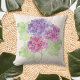 Dit zomerkussen voor buiten, versierd met drie waterverf hortensia's in roze en kalmerende lavendel, is het ideale accent voor uw terrasmeubilair.