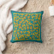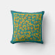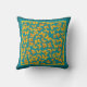 Een Sierkussen of kussen, met een patroon van gouden buikvlies, in waterverf geschilderd door Judy Adamson, op een blauwgroen achtergrond.
