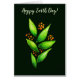 Waterverf plant kaart met een tekening van een abstract groen plant met scherpe bladeren en oranje bessen op een donkergroene achtergrond en de aanpasbare tekst "Happy Earth Day".