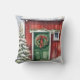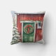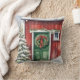 Waterverf groene schuurdeur met groene kerstkrans in sneeuw.