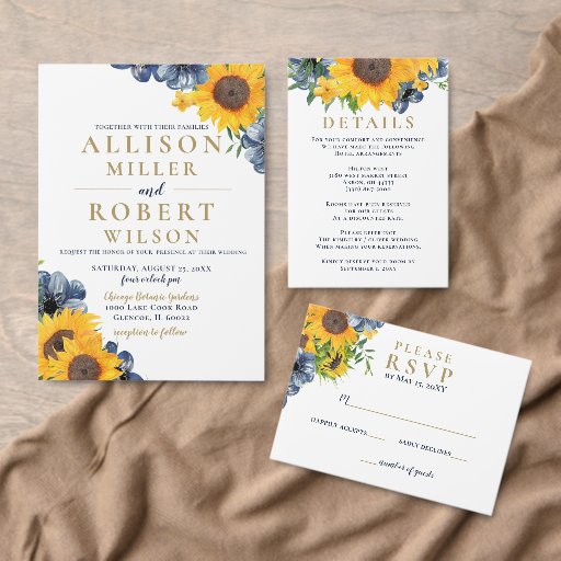 Waterverf Navy Blue Gold Sunflower Rustic Wedding Design with Bouquet of Sunbloemen and Navy Blue Flowers, Beauful Combination of Navy and Yellow for a Rustic Chic Wedding or a country Wedding.