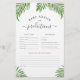 Een schattige baby advies & voorspellingen kaart met een waterverf palm verlaat lijst. De achterkant van het ontwerp is versierd met een groene waterverf om perfect aan te sluiten op de voorkant van het ontwerp. Er is ruimte voor de gasten om hun geboortevoorspellingen, gelijkenissen voorspellingen en advies voor de nieuwe ouders te schrijven. Deze activiteitenkaart is gemaakt om te matchen met ons Safari Animals Wild One Baby shower collectie. Uitzicht het collectie dat op deze pagina is gekoppeld om de volledige set weer te geven. Voel je vrij om me te berichten met eventuele vragen, ik zal graag helpen!