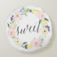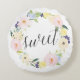 Romantisch rond kussen met waterverf pastelbloemen en moderne kalligrafie.