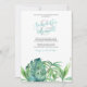 Deze eenvoudige uitnodiging van het buitenrepetitieve diner kenmerkt uw namen die in een stijlvolle handgeschreven manuscripttypografie met gebeurtenisdetails in een klassieke grove serif van de houtskool op een scherpe witte achtergrond worden geplaatst. Een replica van mijn oorspronkelijke waterverf palm en monstera bladeren in schaduwen van groen kleurt de voorkant. De uitnodigingskaart keert terug naar een complementaire kleur van de turquoise van zee. Een kustchic, maar elegant gekozen voor een achtertuin tiki party, casual strand bruiloften van Florida of een tropische tuinpartij. Om meer waterverf te zien tijdens het diner, surfideeën van Victoria grigaliunas, bezoek DoTellABelle op Zazzle.