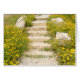 Waterverf tuin met gele bloemen in bloesems en stenen trappen