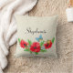 Een elegant elegant vierkant gooit een kussen met een grillige waterverf grond van rode papavers en vlinders. Pas dit romantische wildbloemontwerp aan door jouw naam toe te voegen.