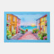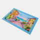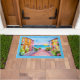 De voorklep van de strandscène is voorzien van een zeebodem met kleurrijke tehuizen van twee verdiepingen, bloempotten en uitzichten zweefboten bij zonsondergang.