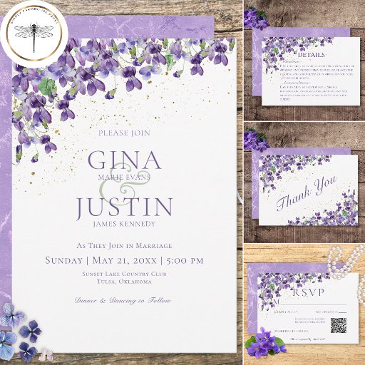 Rustic Purple Violets Gold Sparkle Wedding SuiteOntworpen door Kathe Santillo