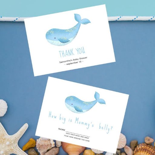 Een klein beetje onderweg met dit onder het zee thema baby shower uitnodiging, met baby walvis in zacht blauwe waterverven.
