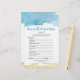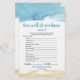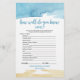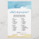 Deze waterverf zand en zee "wat er in je handtas zit" is perfect voor een strand vrijgezellenfeest. Aan de voorkant van de gamekaart staat "hoe goed ken je de bruid" en aan de achterkant van de kaart staat "wat er in je tas zit". Het abstracte ontwerp kenmerkt een geel en blauw waterverf textuur dat geschikt is om zeeviben uit te roeien. Pas de voorzijde van de kaart aan met de naam van de bruid- en vrijgezellenfeest-datum.