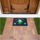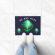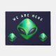Cool fun doormat with a printed image of 3/three green alien heads on a very dark blue background, with a caption/phrase which reads "WE ARE HERE"