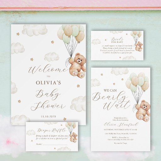 Welkom uw kleintje in stijl met deze charmante baby shower uitnodiging! Met een zoete teddybeer die ballonnen in neutrale tinten vasthoudt. De uitnodiging is volledig aanpasbaar, zodat u al uw gebeurtenisgegevens kunt toevoegen, inclusief de naam, datum, tijd, locatie en RSVP-informatie.
