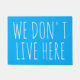 Ben je op zoek naar een grappig portret? Wat dacht je van dit coole turkooiskleurendorf dat zegt: "WE LEVEN HIER NIET", gedrukt in grote witte letters? Perfect! Nu weet iedereen dat je daar niet leeft!