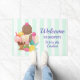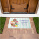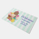 Een leuke welkomstdeurmat met een ijsthema dat zegt: we zijn de coolste. Geïllustreerd met een tekening van een 3-scoop ijszonde met kleurrijke strooisel. Een ijskegel met schep chocolade, aardbei en vanille. Een kom neopolitaans ijs met een kers erop. Aardbeien en een ananasvrucht zitten naast de kommen. Zomer en zoet. Een muntgroen en wit streepjespatroon op de achtergrond.