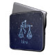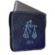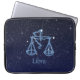 Laptophoes met het symbool voor Libra in zacht zilverblauw, bedekt met de sterren van de constellatie, tegen een sterrenhemelachtergrond van diep-middernacht blauw tot zwart