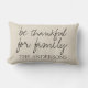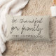 Een decoratieve kussen in neutraal natuurlijk beige met de uitdrukking "ben dankbaar voor familie"gedrukt in modern manuscript en uw douanenaam in typografische brieven voor modern landbouwstijlinterieur. Het is gemakkelijk aan te passen gebruikend het verstrekte gebied van de sjabloon.