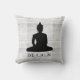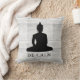 Motivatie gooien kussen met boeddha-afbeelding en kalme typografie op een rustige witte houtachtergrond.