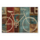 © Michael Mullan / Wild Apple. Een afbeelding van een witte fiets tegen een gekleurde achtergrond. De achtergrond is een collage van vierkantjes in verschillende kleuren en schoppen.